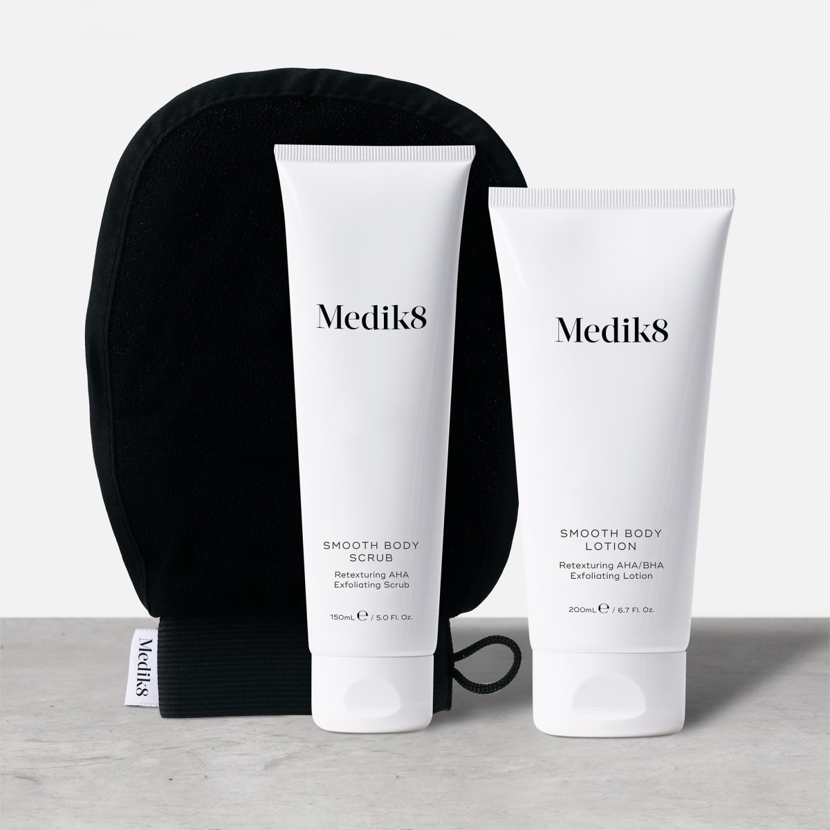 Αποτελείται από το Medik8 Smooth Body Scrub και το Medik8 Smooth Body Lotion, ένα Kit απολέπισης τριών βημάτων που αναζωογονεί αμέσως το τραχύ, ξηρό ή ανώμαλο δέρμα.